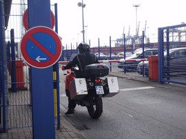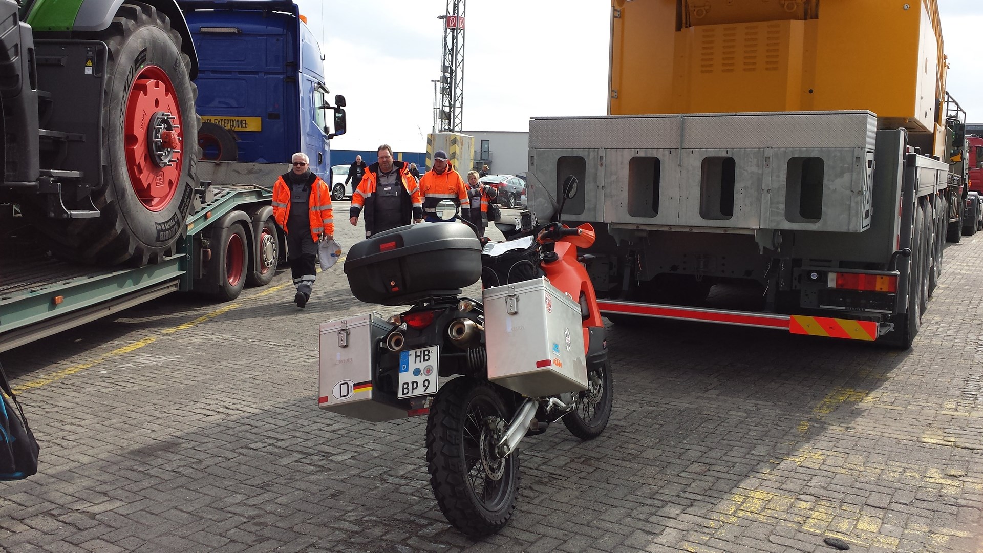 Bei der BLG in Bremerhaven geht dann der Stress los: Hier ist man der Meinung, ein Mann reicht aus, um alle ankommenden Anlieferungen zu bearbeiten. Also erst mal Schlange stehen mit 5 LKW-Fahrern vor uns. Nach einer halben Stunde, jetzt sind auch 4-5 LKW-Fahrer hinter uns, sind wir dran, auf einmal geht alles ganz schnell. War ja gar nicht so schlimm.