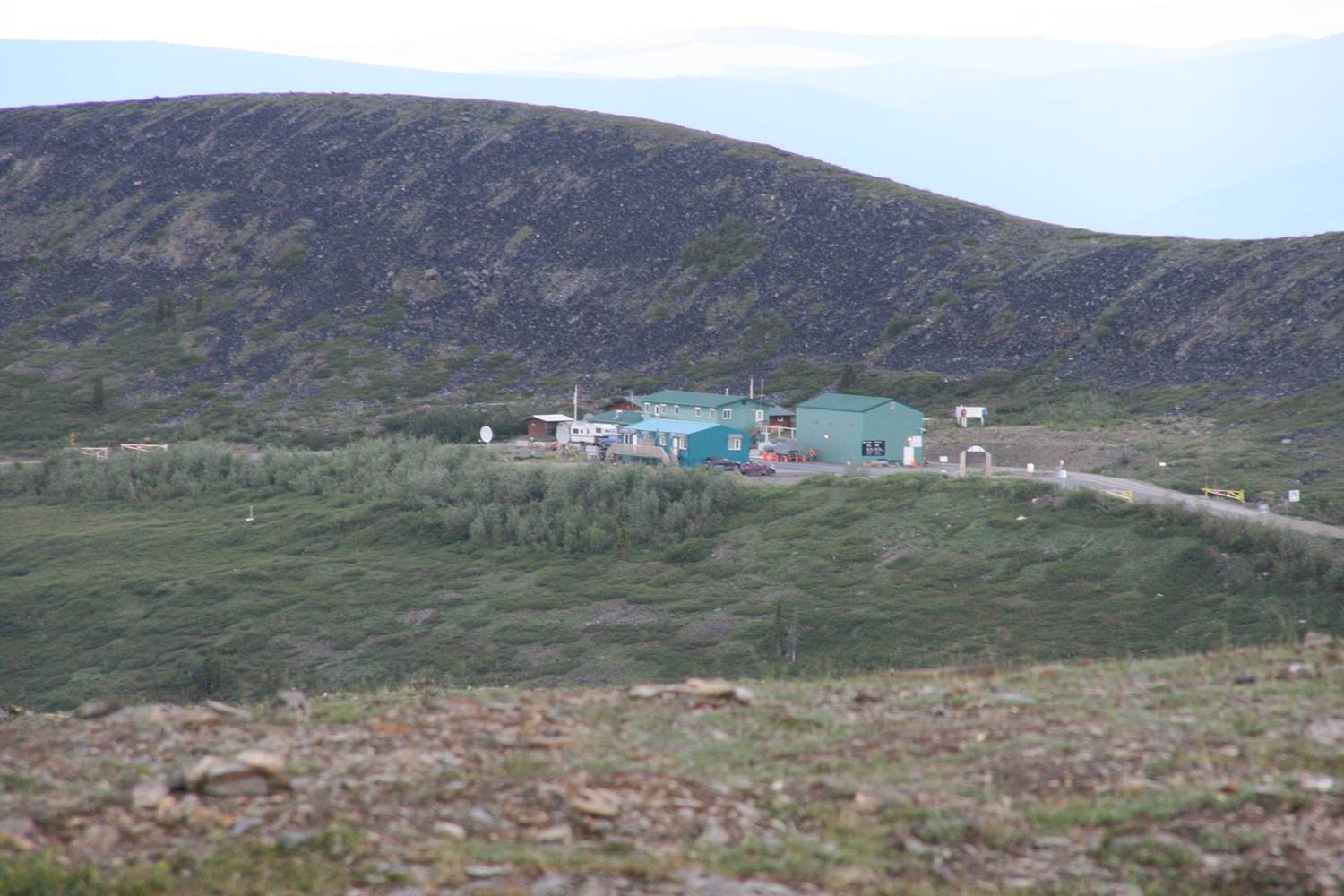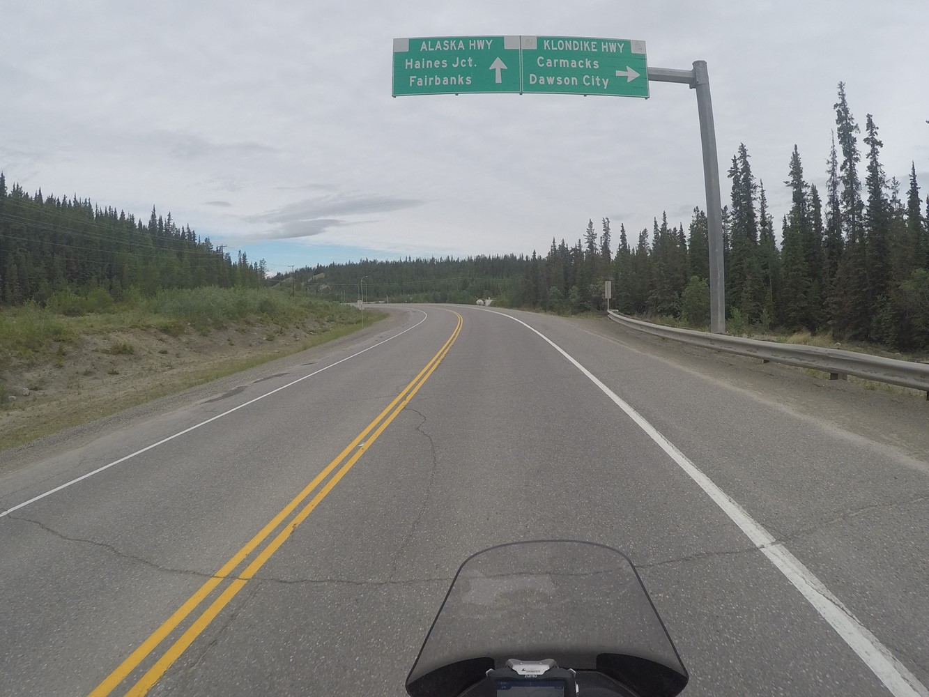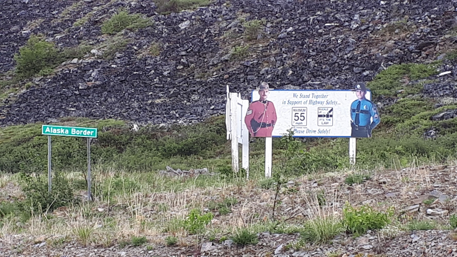 Nach 3 Stunden erst schön sonniger, dann immer regnerischerer Fahrt ist sie erreicht: Die Grenze zu Alaska - Zwei Buden im Nirgendwo.