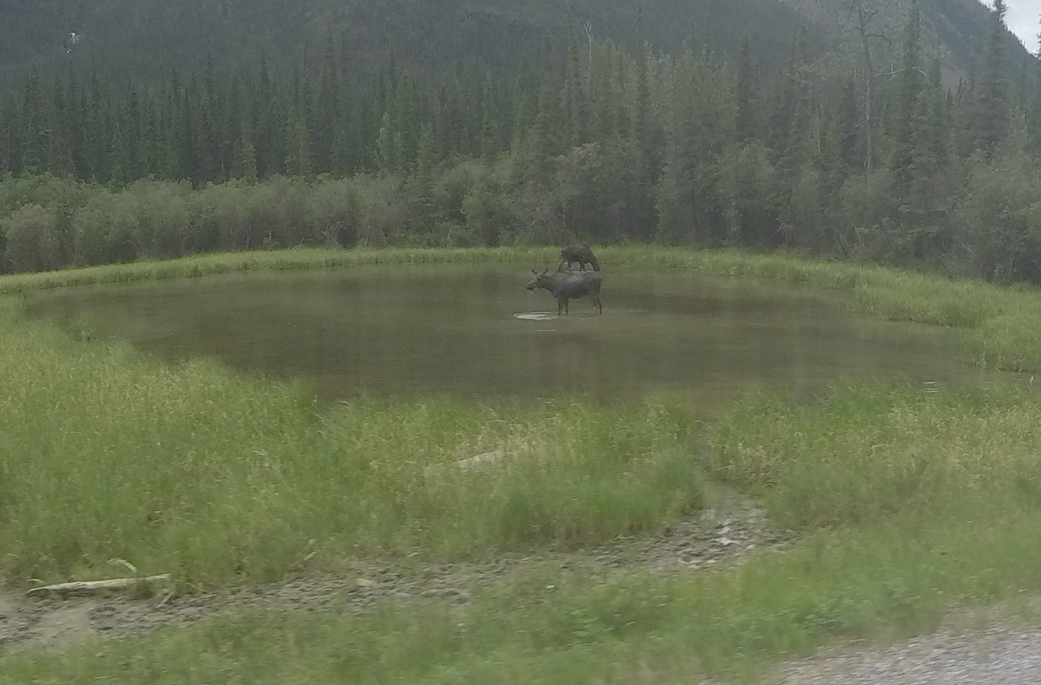 Überraschung: Zwei Elche (moose) weiden den Teichgrund ab, und das direkt neben der Straße.