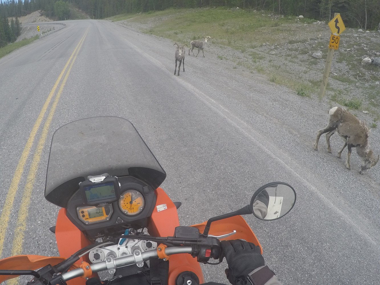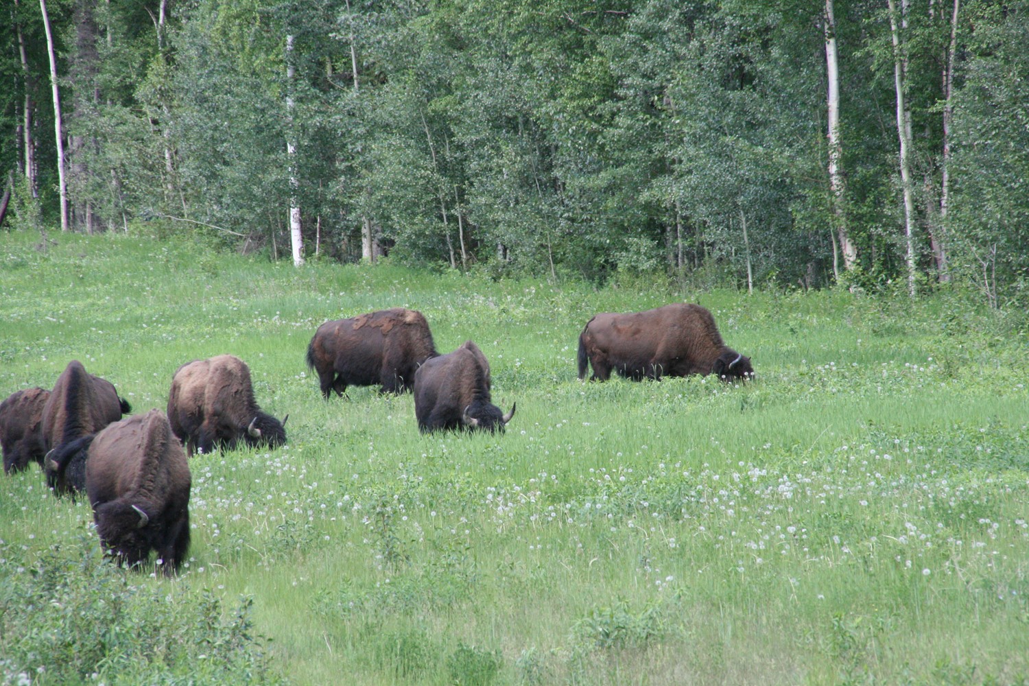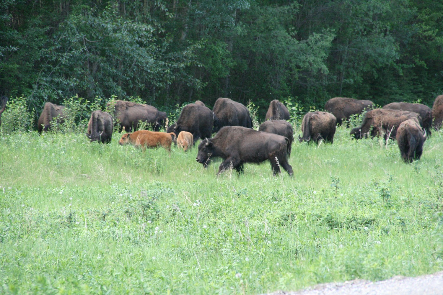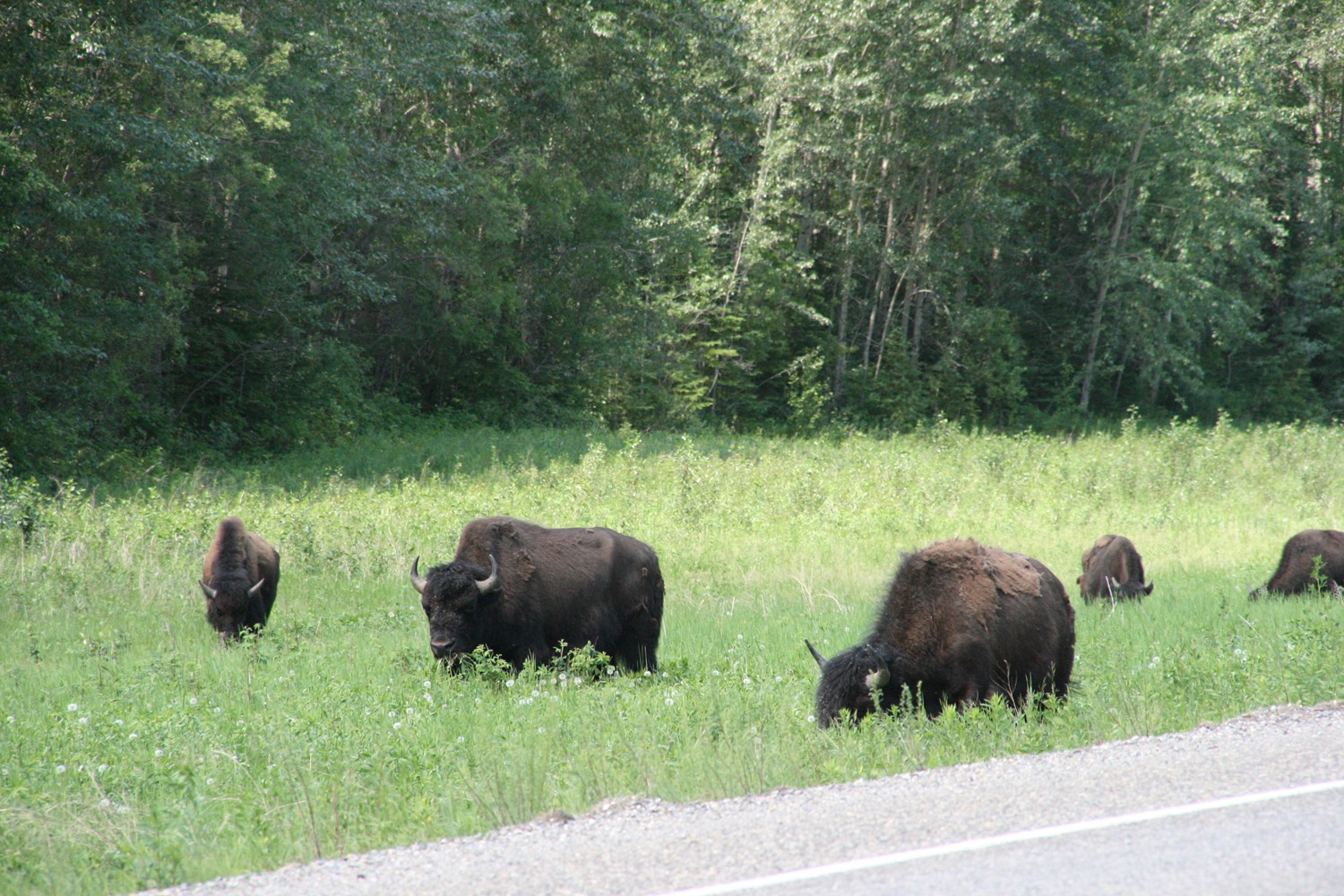 und dann sind sie da: Meine ersten Bisons. Auch sie finden, dass es neben der Straße am besten schmeckt.