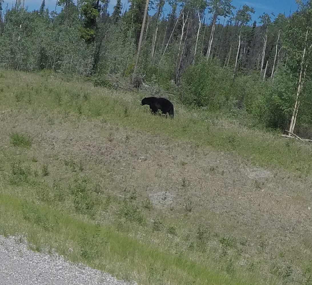 Auch der Schwarzbär bleibt ganz gelassen. Ein schräger Blick von der Seite und er trottet weiter am Straßenrand. Auch mein Motorengeknatter bringt ihr nicht aus der Ruhe.