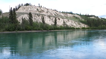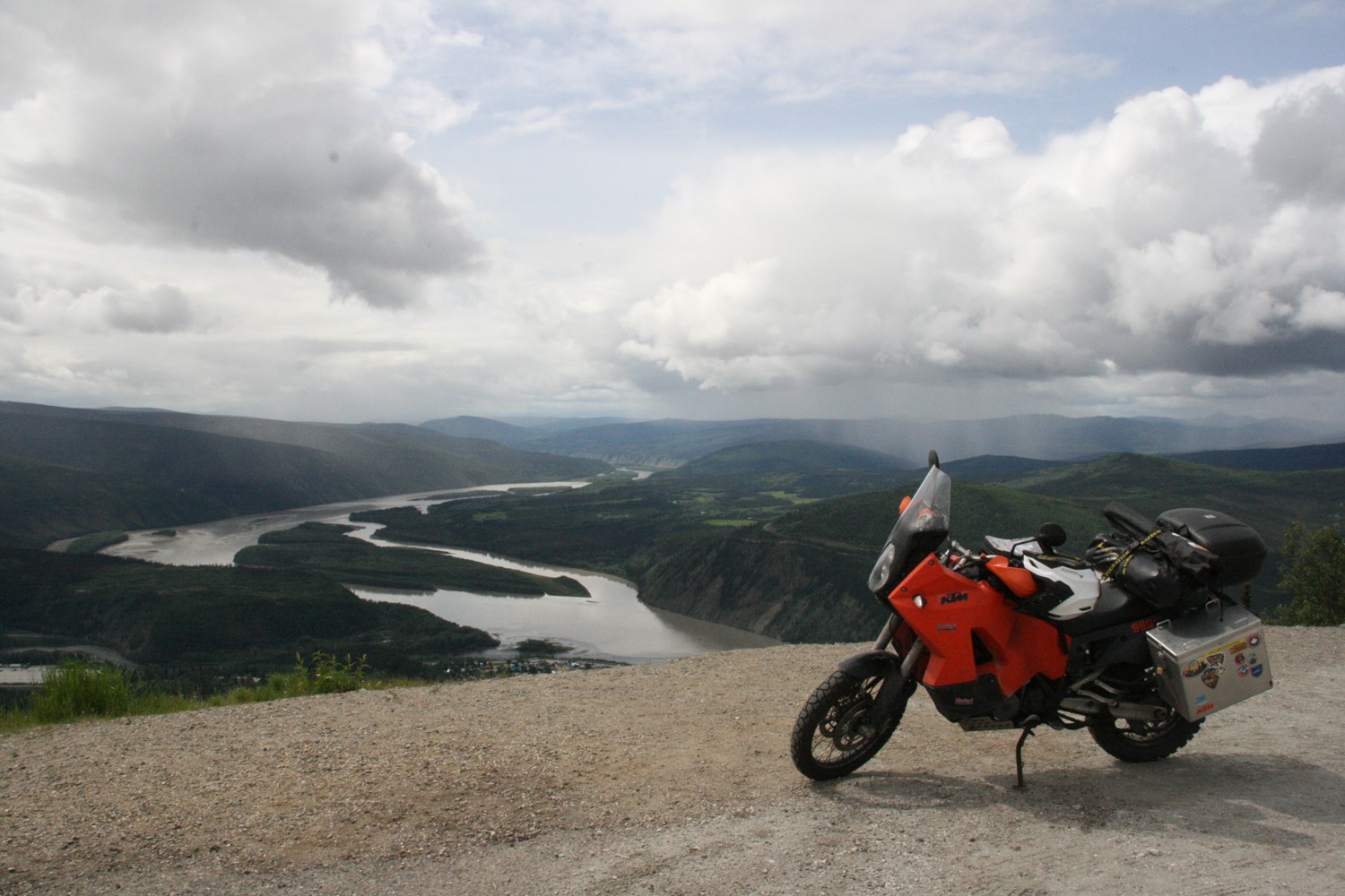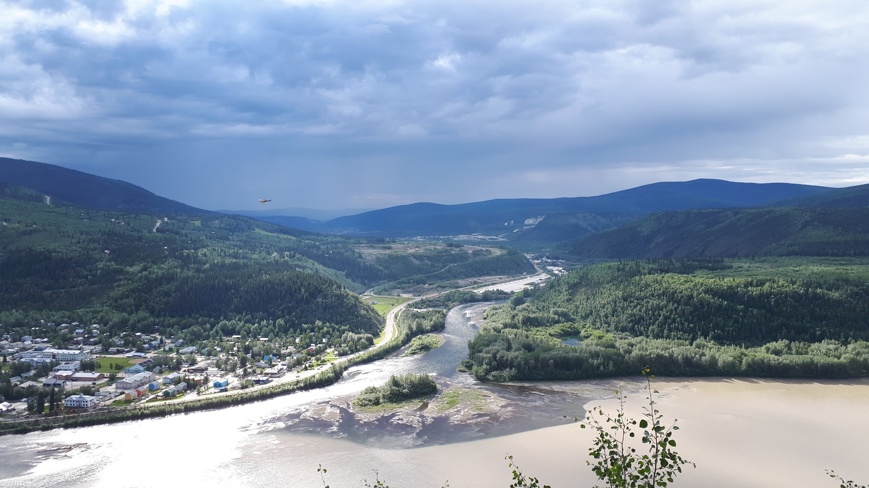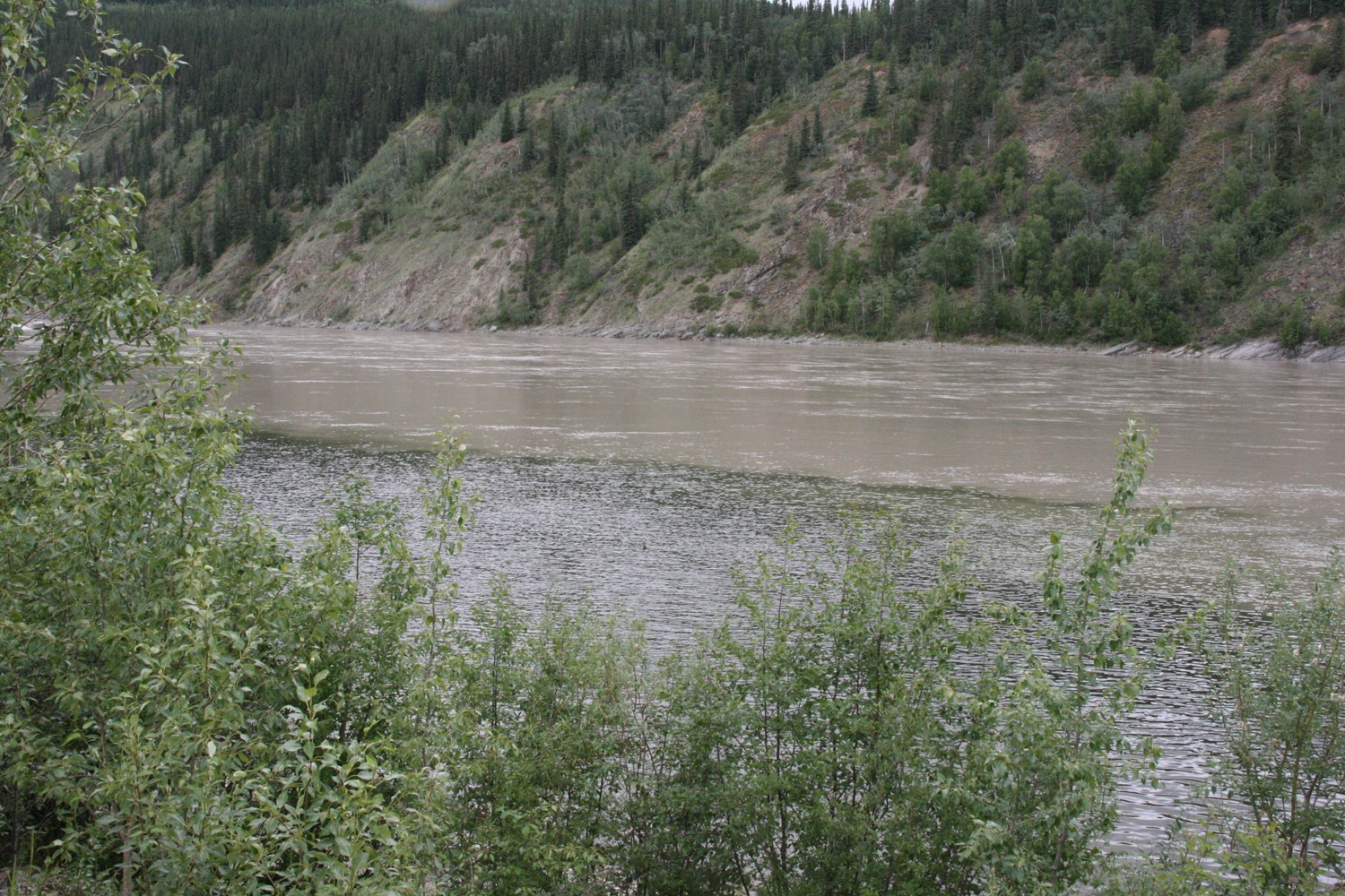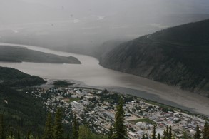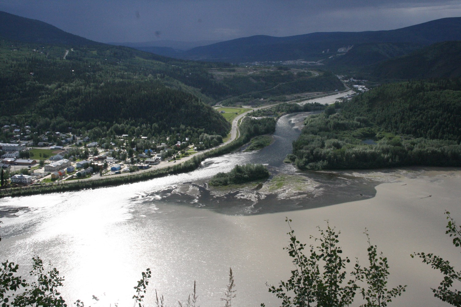 Der klare Klondyke fließt in den schlammigen Yukon. Im Hintergrund gut zu sehen: Sauwetter über dem Dempster Highway.