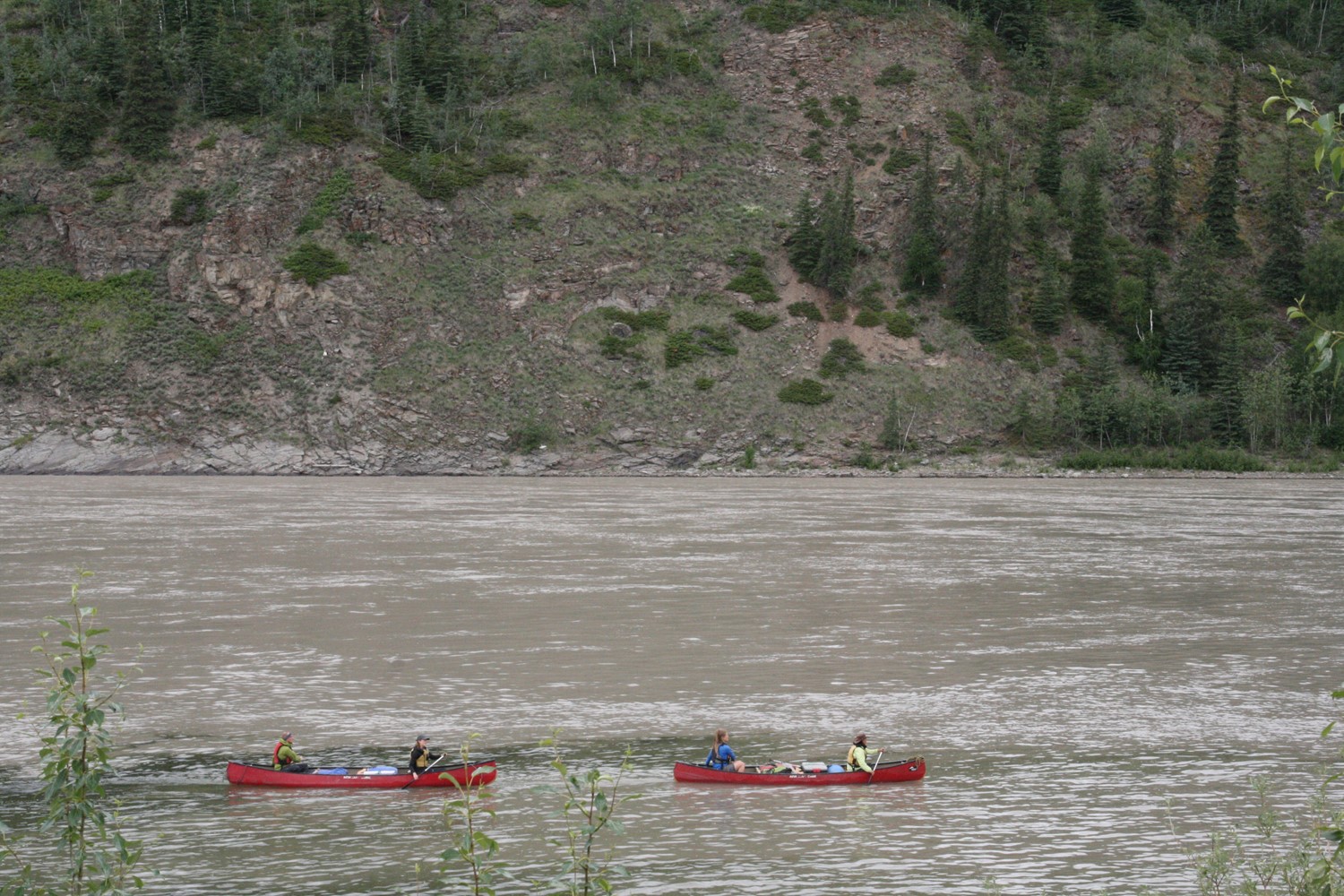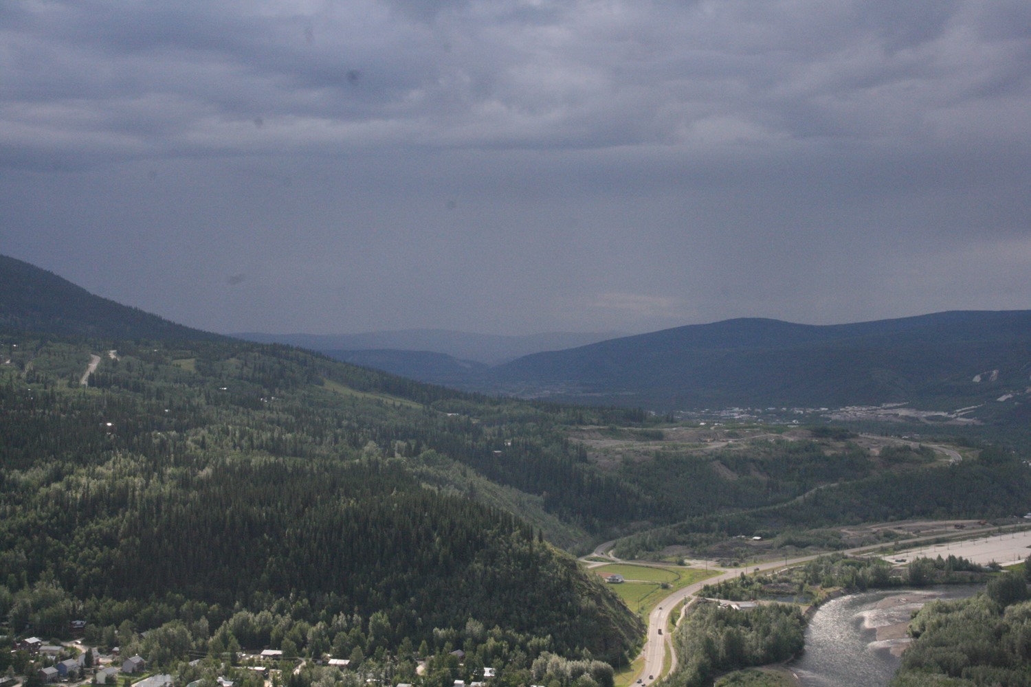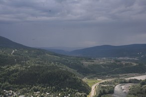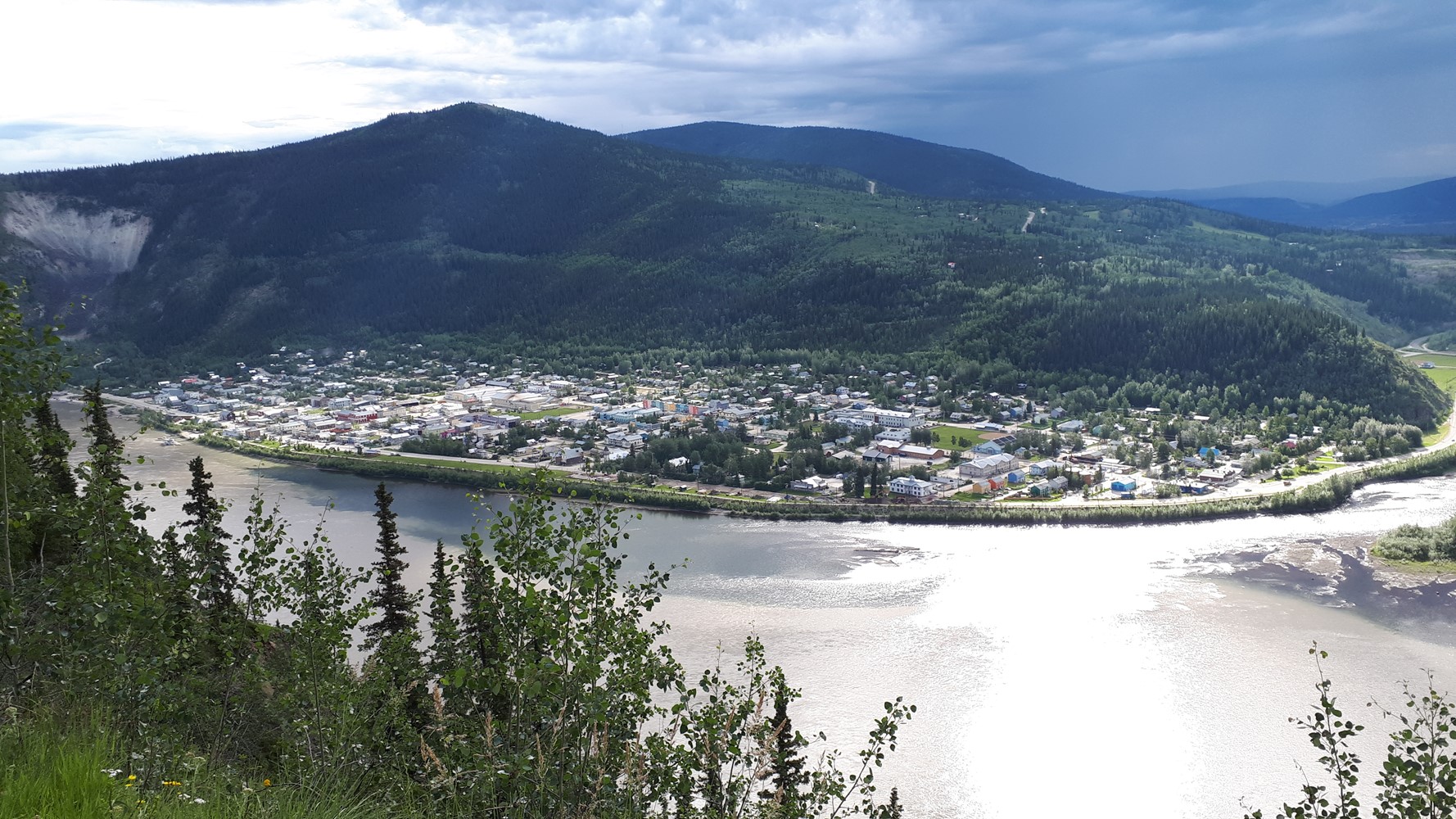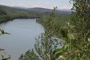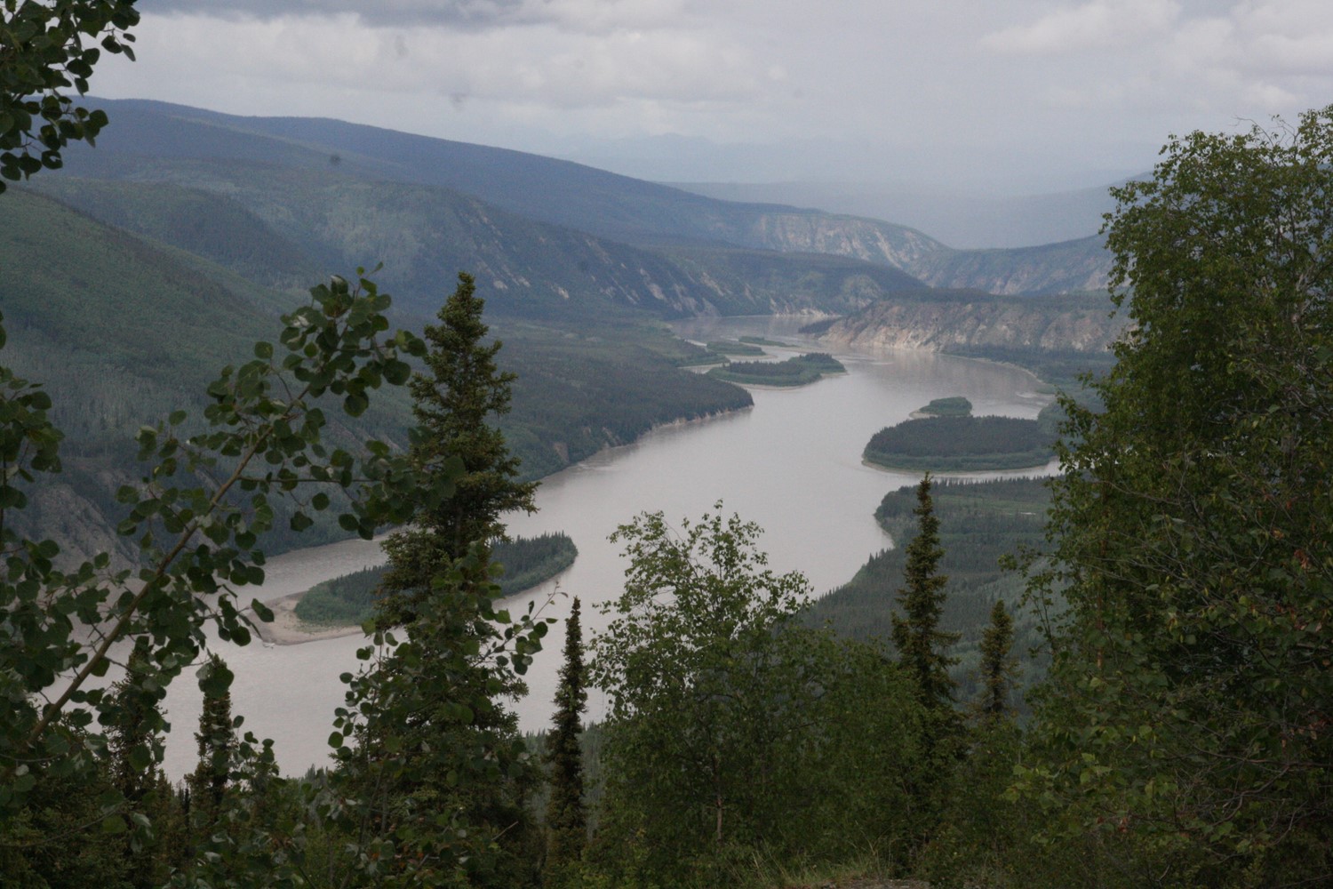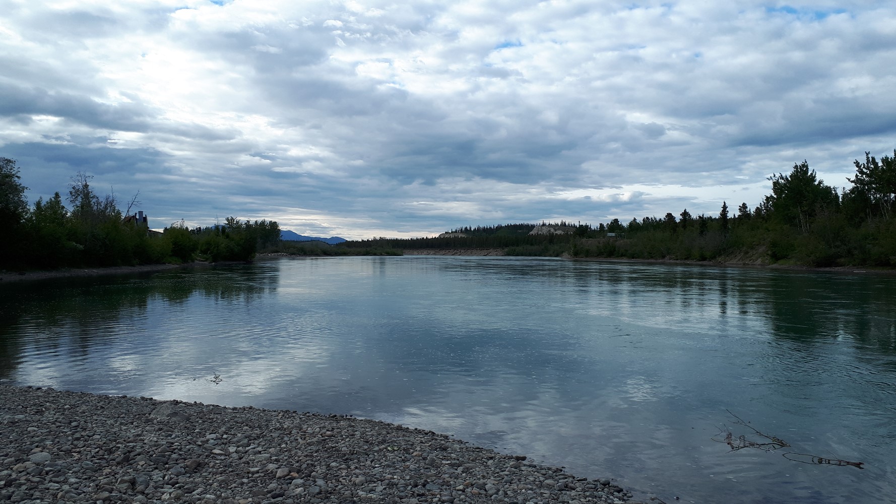 Der klare Klondyke fließt in den schlammigen Yukon. Im Hintergrund gut zu sehen: Sauwetter über dem Dempster Highway.