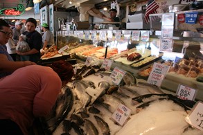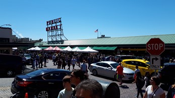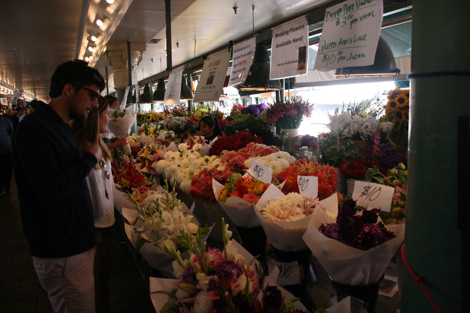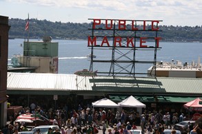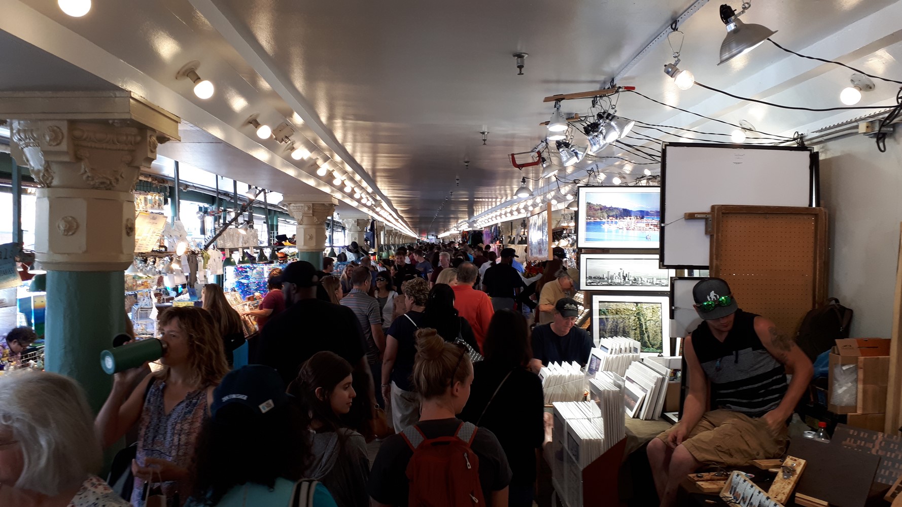 Samstag gehts nach Seattle Downtown. Hier boxt der Papst. Es sieht zwar zuerst noch recht gemächlich aus, aber bei Pikes Public Market herrscht ein irres Gedränge. Hier kann man sich die leckersten Sachen (besonders seafood), schöne Blumen, wüsten Kitsch und einen Haufen anderer Sachen kaufen. Und es herrscht ein Gedränge und Geschiebe wie in den vatikanischen Museen.
