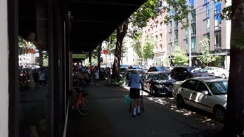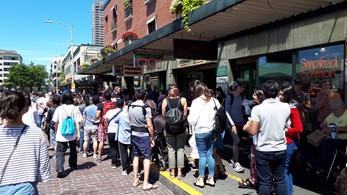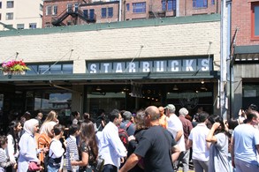 Draußen ist es auch nicht ruhiger. Lange Schlangen vor den angesagten Bistros, und natürlich der Ur-Starbucks. Davor steht eine Schlange von ca. 200 m Länge. Nicht zu fassen.