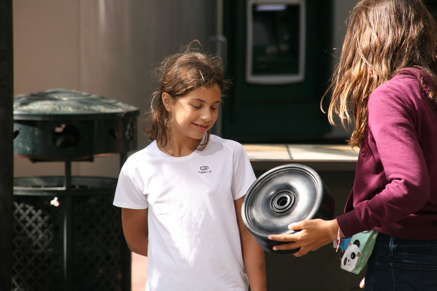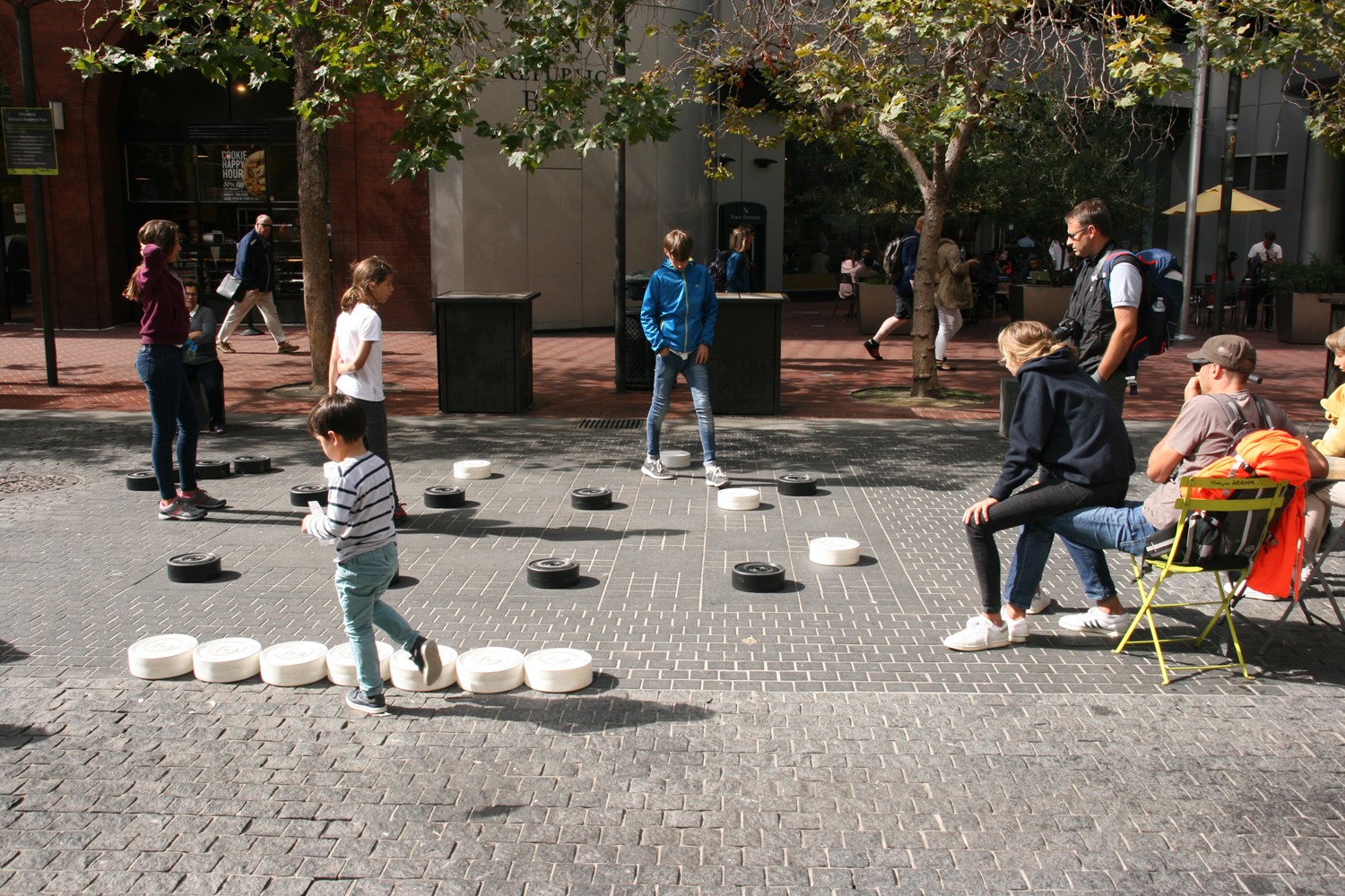Mitten in den Straßenschluchten ist ein Dame/Schachfeld gepflastert. Kiddies spielen mit großer Begeisterung. Sie weiß schon (und die meisten Zuschauer auch), dass sie gleich eine Dame gewinnen wird, ihr Gegner wohl noch nicht.