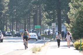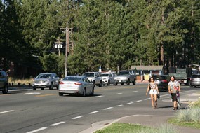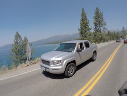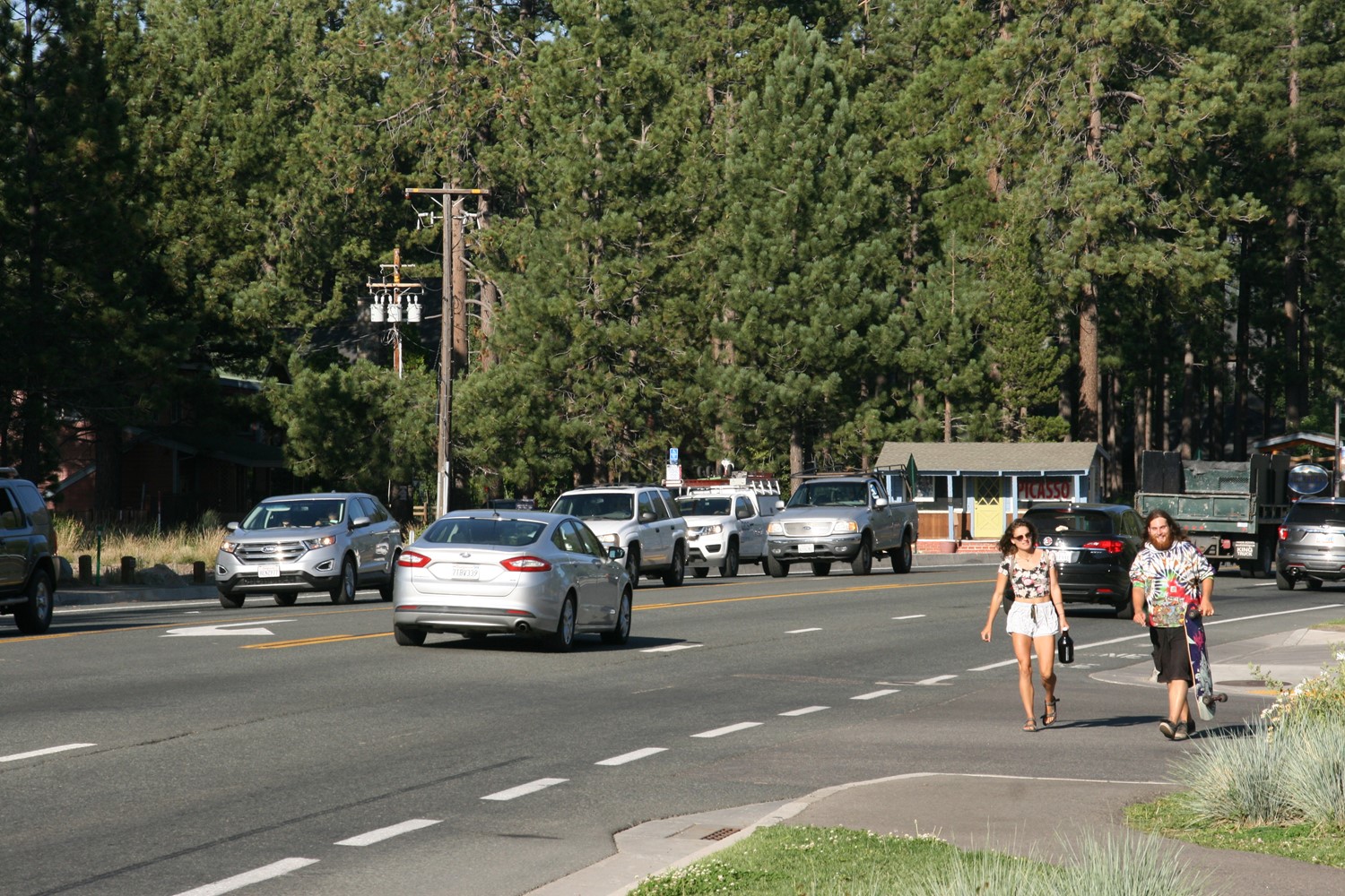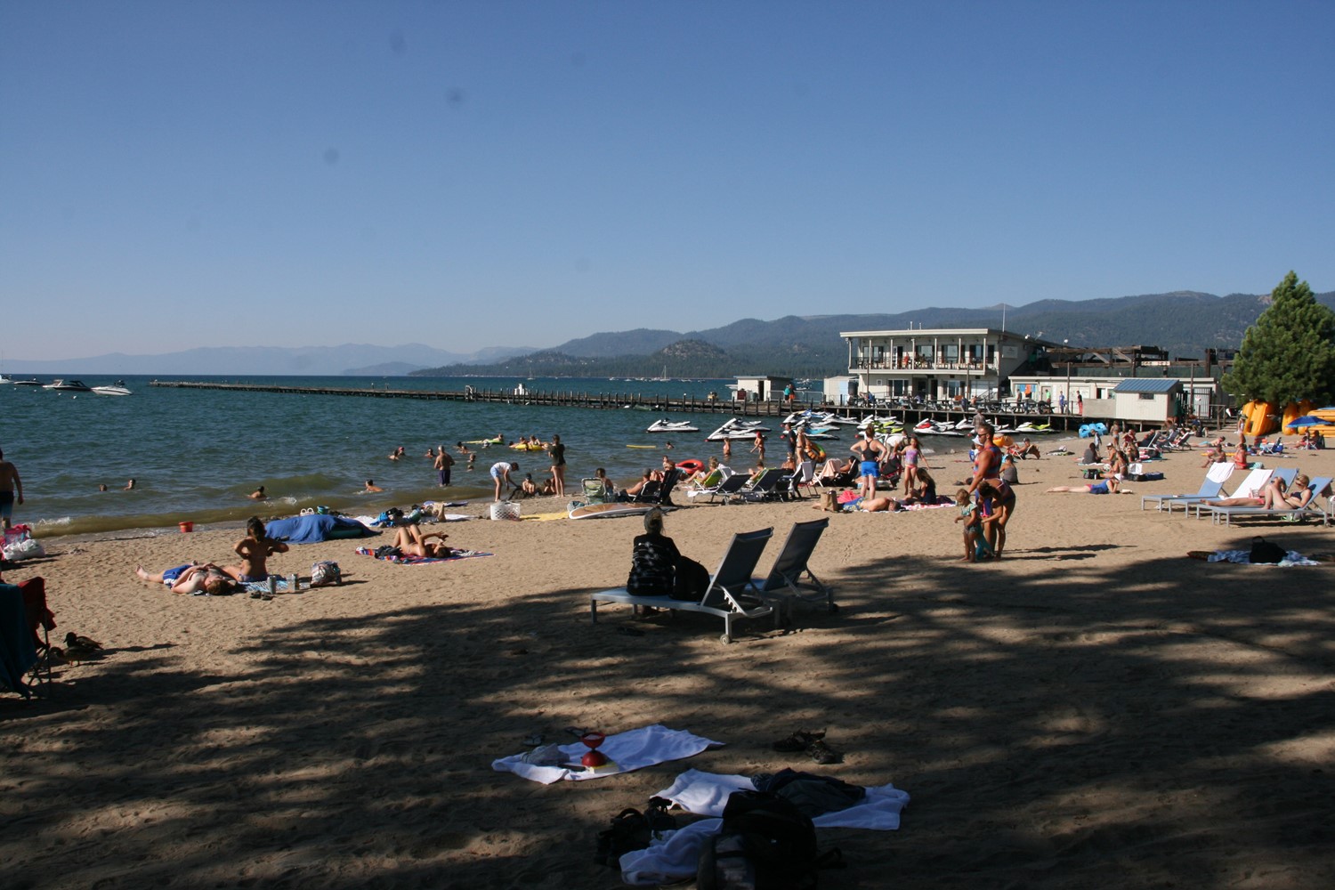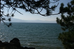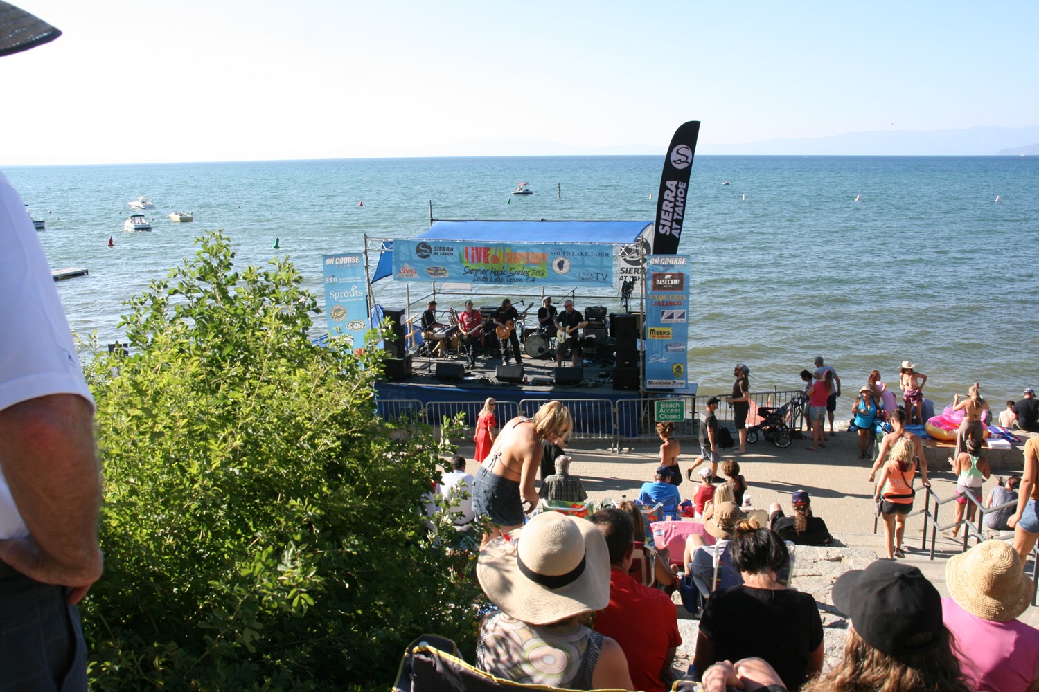 Lake Tahoe: Meist felsiges Ufer. Jeder Sandstrand ist dicht bevölkert. Aber wie in USA üblich muss man erst einen Highway (hier die US 50) mit tagsüber dichtem Verkehr überqueren, der den Ort mit Hotels, Gastronomie und Campingplätzen vom Wasser abschneidet. Wenn man das geschafft hat, gibt's zu Belohnung ein kleines Freiluftkonzert.