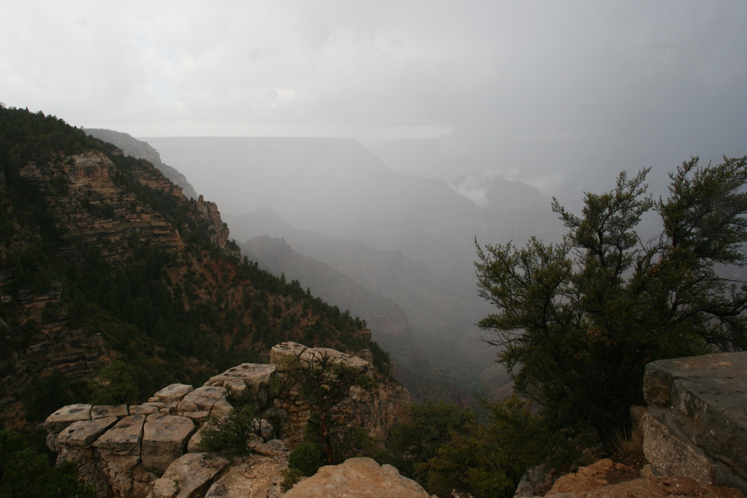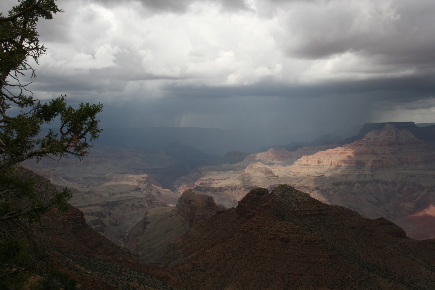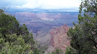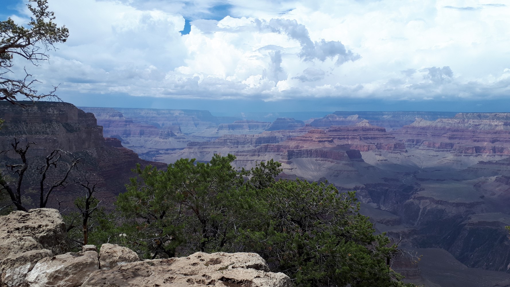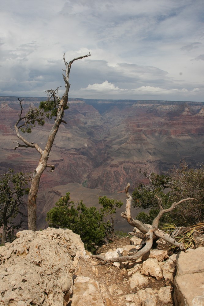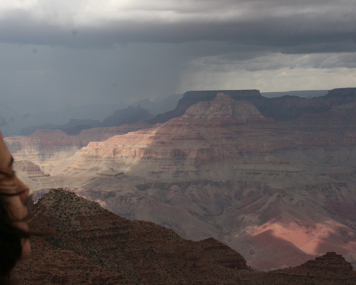Und die Rechnung geht auf. Im Hintergrund noch ein paar Blitze und Donnergegrummel, dann gewinnt die Sonne wieder die Oberhand und bietet weite Blicke über den Canyon. Wie soll man solch großartige Panoramen nur auf so kleine Fotos kriegen?